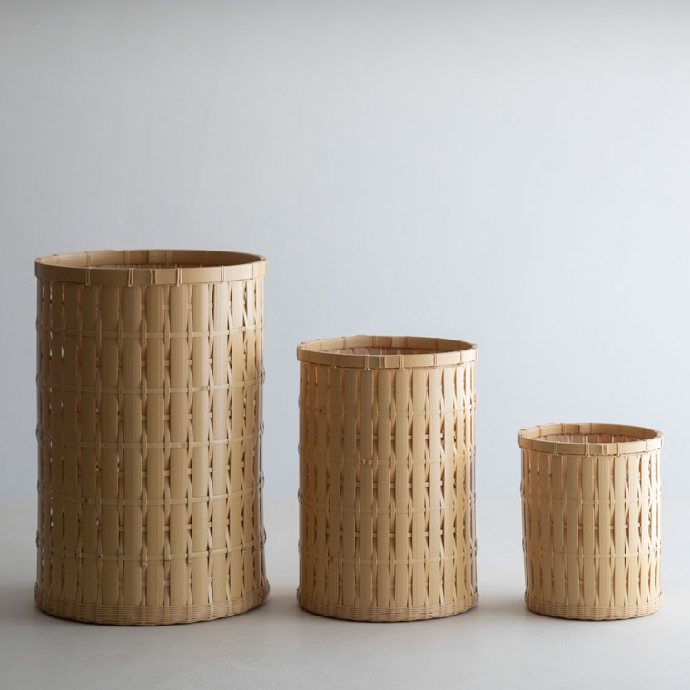 円筒形のカゴは、L.M.Sの3サイズあり、インテリアに、布や紙類入れに、屑かごにと用途は自在です。Sサイズはキッチンや卓上でも使えます。