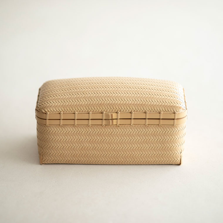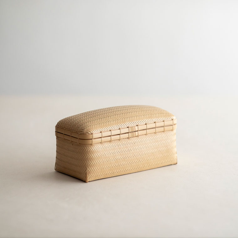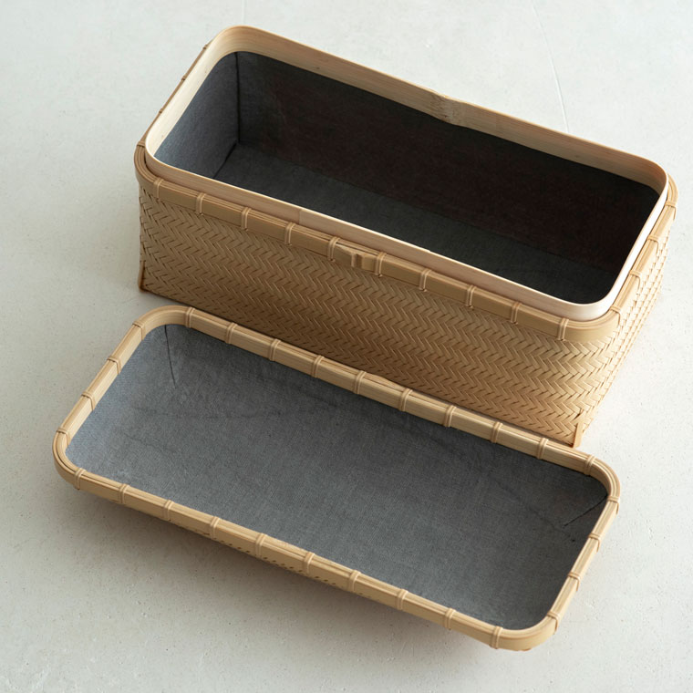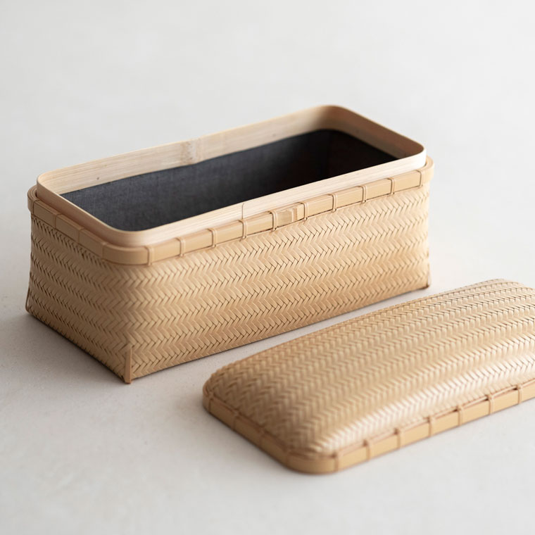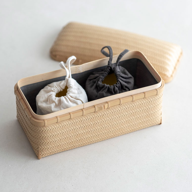 細い竹ひごを網代編みした蓋付きの小物入れ。編んだ竹の美しさを生かすため、四隅の補強もできるだけシンプルに。籐かがりなど細部まで清潔感の漂うつくりです。内側には国産リネン100%の布を張っています。サイズはLとMの2サイズのほか、セミオーダーも可能です。