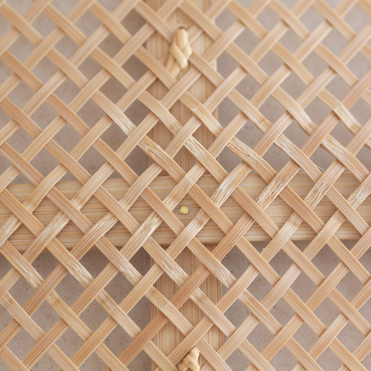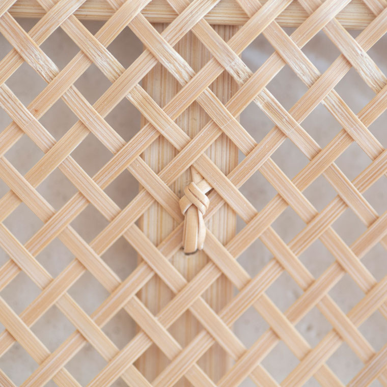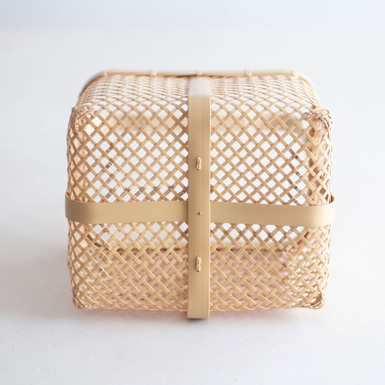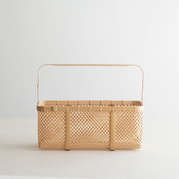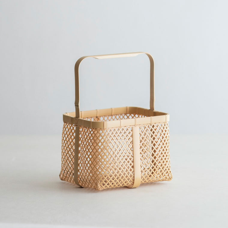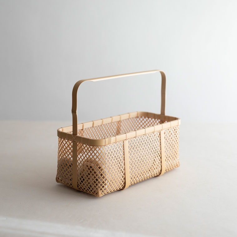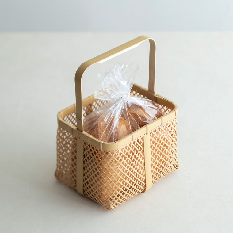 透け感のある四ツ目編みの軽やかなパンかご。繊細な編みを支えているのは、縁や底から持ち手までぐるっとつながる幅広の竹。中央にも同様に幅広の竹を組んでいて、竹の繊細さと力強さが魅力です。買い物かごに使ったり、そのまま飾っても。サイズはLとMの2サイズです。