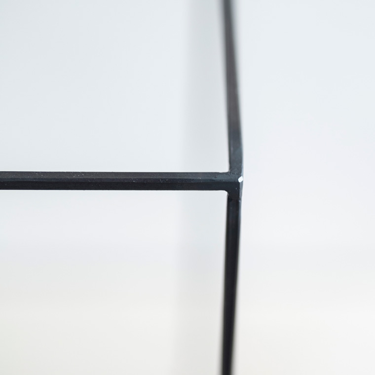 細いフレームと薄い鉄板を合わせたシンプルな飾り台。「花器を置いた時に程よい、花を生けやすいバランスにしています」と田中潤さん。花を飾った時の空気感を切り取るフレームは、3ミリ角の鉄の棒を鍛造機で叩いて面取りを施しています。「面取りすることで角棒の角が取れると、そこに空気が通る。やわらかく見えるんです」。一見すると細くて真っ直ぐに見えますが、実は叩きによって生じる歪みを、味が出すぎない程度に伸ばして戻しているそうです。