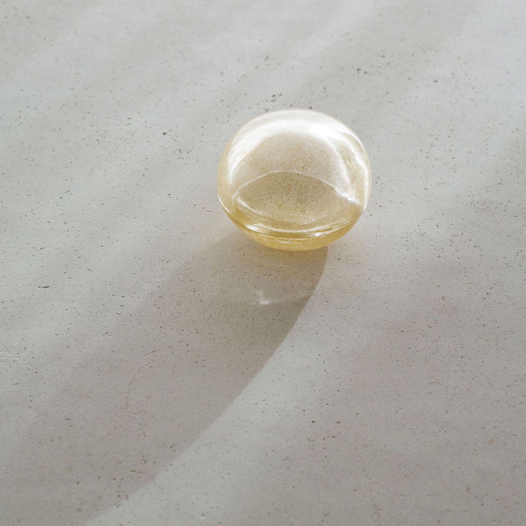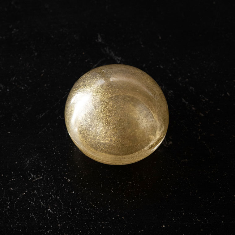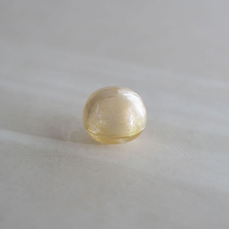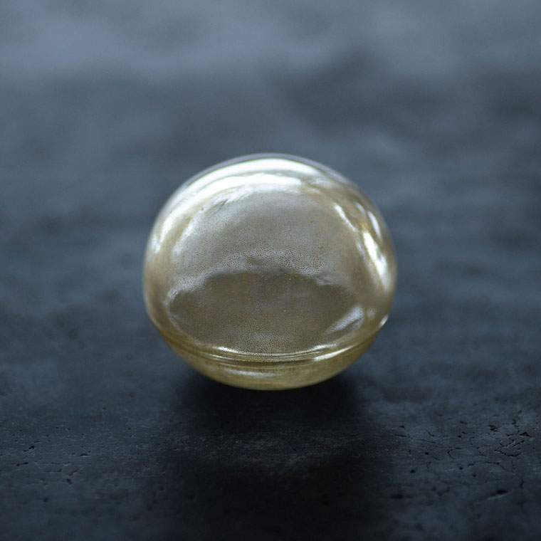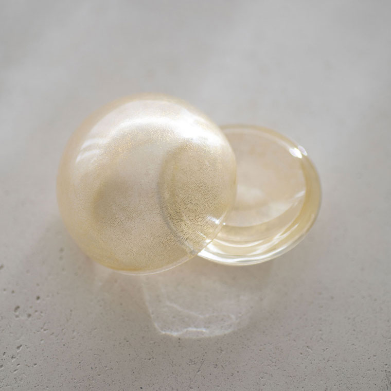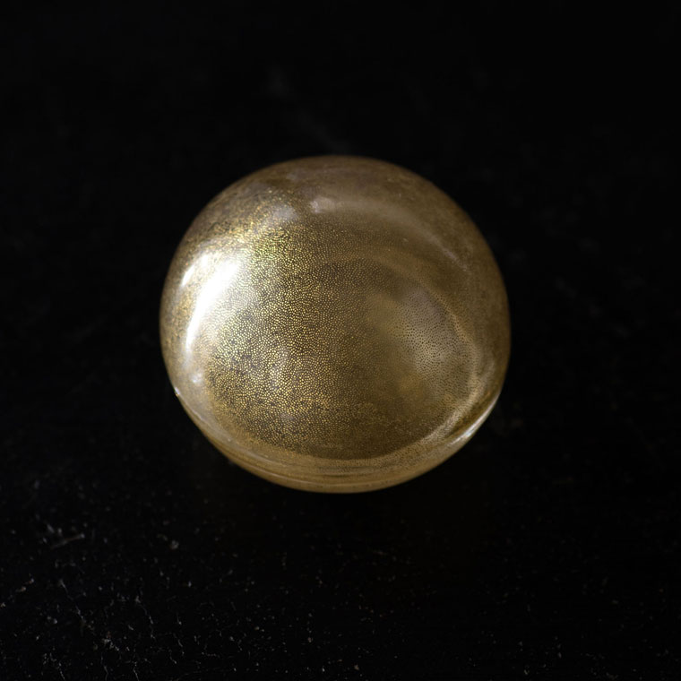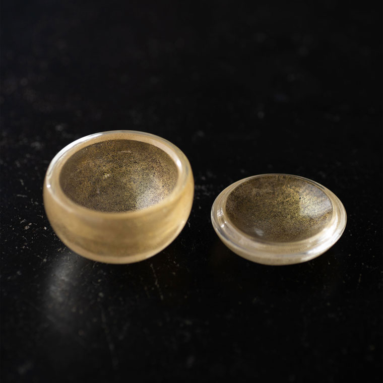 「粒子」という響きの通り、手の中におさまる蓋物が見せてくれる壮大な宇宙感が魅力です。肉眼ではなかなか見えないほどの小さな金の粒は、一つ一つ描くのではなく、ガラスに焼き付けた金箔(