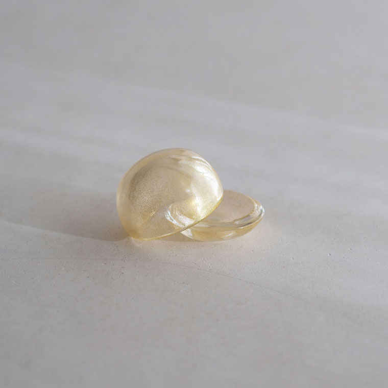 蓋物の用途は自由で「香合をはじめ、いつ見ても心引かれるもの、自分で発見した美しいと思ったもの、新しく出会ったものなどを入れていただけたら嬉しいです」。ガラスとガラスを擦り合わせ、ピッタリと合わさるように作っています。アクセサリーや揮発性のもの、薬品などもある程度の期間であれば状態を保ちやすいのもガラスの器の良いところだそうです。
