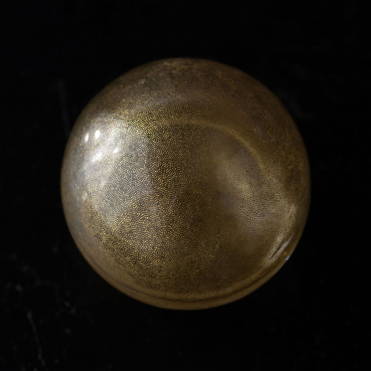 「焼き付けた金澄の表面を同じように削り出しても、金が二重になっているところ、焼き付きの違い、微かなヒビなどの違いで表情が変わってくるのが面白い所です。均一に小さな粒を削り出し、埋め尽くさないと見えて来なかったガラスと金の表情があります」。