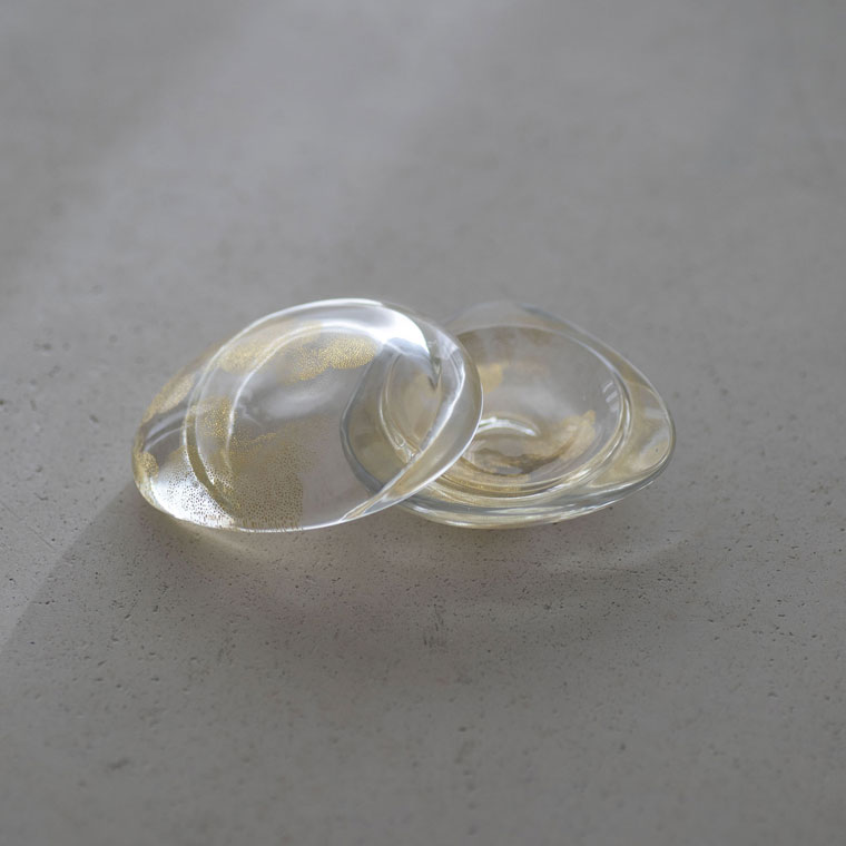 蓋物の用途は自由で「香合をはじめ、いつ見ても心引かれるもの、自分で発見した美しいと思ったもの、新しく出会ったものなどを入れていただけたら嬉しいです」。ガラスとガラスを擦り合わせ、ピッタリと合わさるように作っていて、アクセサリーや揮発性のもの、薬品などもある程度の期間であれば状態を保ちやすいのもガラスの器の良いところだそうです。「蛤の殻は、自然の造形の中でも、好きな形です。富士山を思わせる曲線は食べた後も捨てがたく、ちょっとした作業の道具にも使っています」。ガラスの蛤形ならではの曲線や厚みもあって、手に伝わってきます。