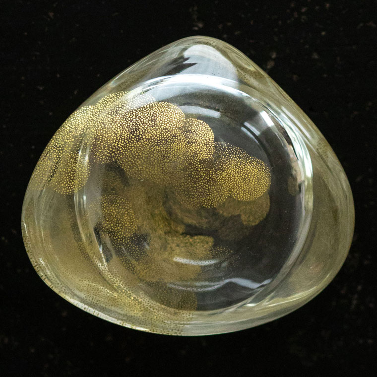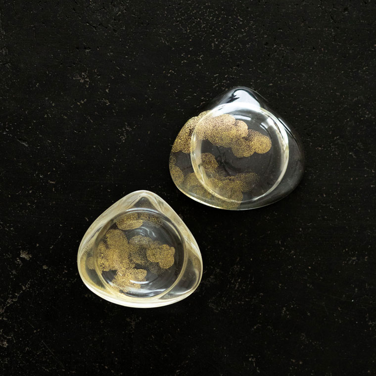 蛤形の蓋物で、極小の金の粒が雲のように浮かびます。肉眼ではなかなか見えないほどの小さな粒は、描いたものではなく、ガラスに焼き付けた金箔(