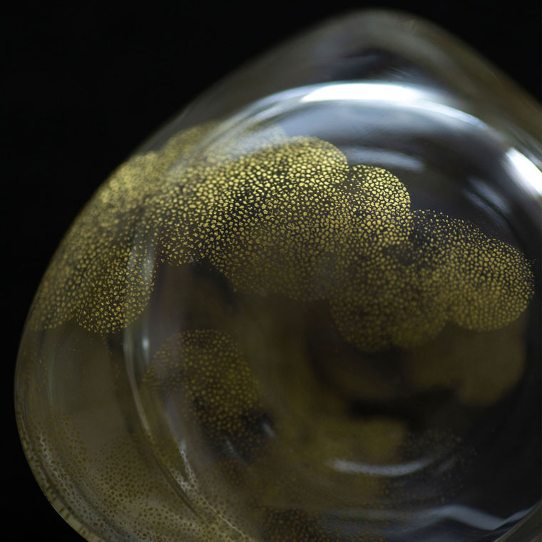 「焼き付けた金澄の表面を同じように削り出しても、金が二重になっているところ、焼き付きの違い、微かなヒビなどの違いで表情が変わってくるのが面白い所です。均一に小さな粒を削り出し、埋め尽くさないと見えて来なかったガラスと金の表情があり、雲は金の粒の削り方を変えて、雲の表情や奥行きを作っています」。
