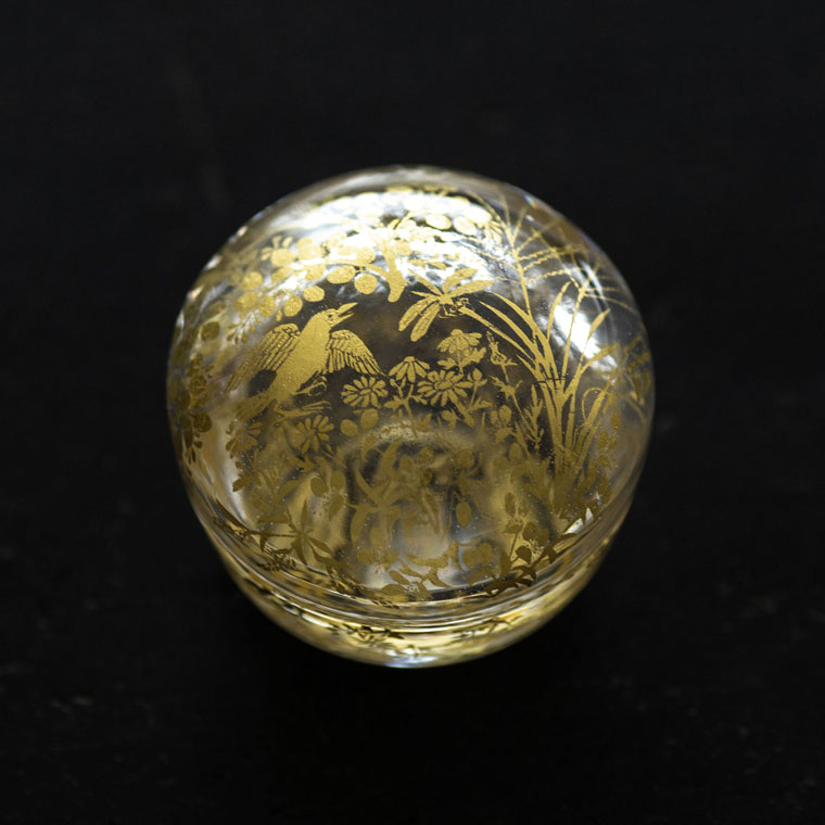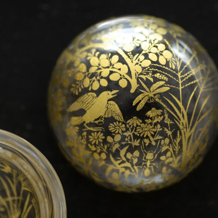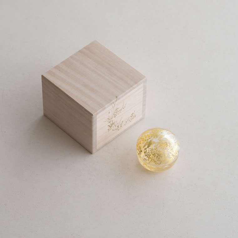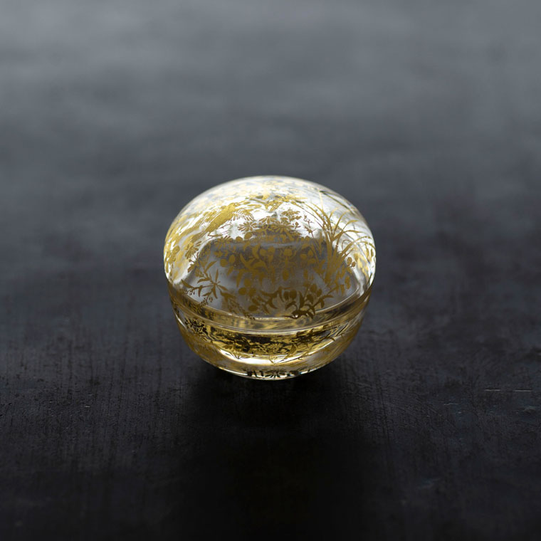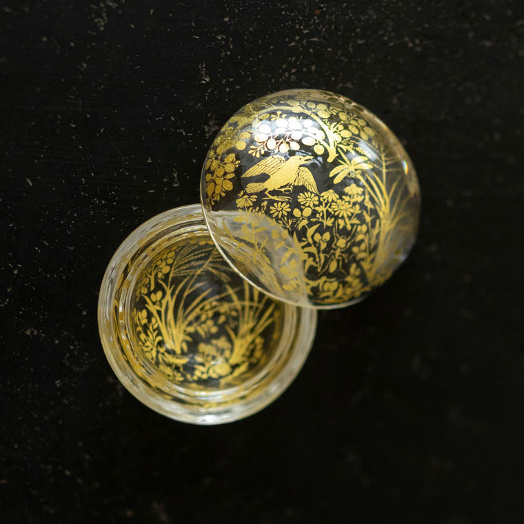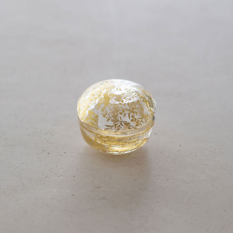 蓋物の用途は自由で「香合をはじめ、いつ見ても心引かれるもの、自分で発見した美しいと思ったもの、新しく出会ったものなどを入れていただけたら嬉しいです」。ガラスとガラスを擦り合わせ、ピッタリと合わさるように作っています。アクセサリーや揮発性のもの、薬品などもある程度の期間であれば状態を保ちやすいのもガラスの器の良いところだそうです。