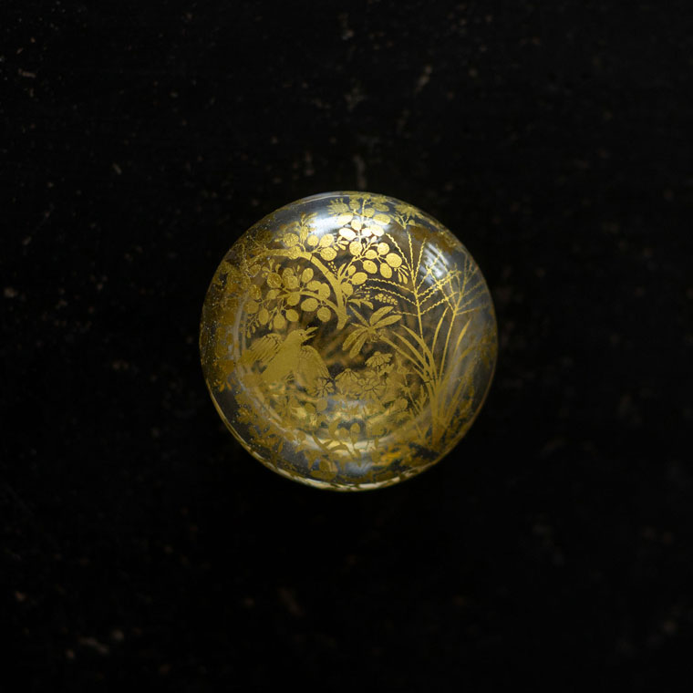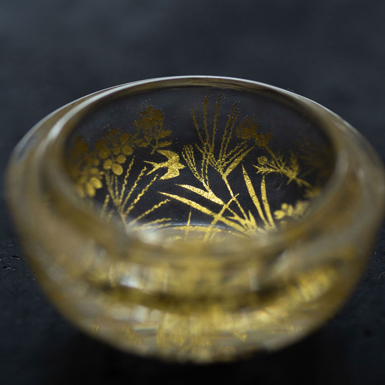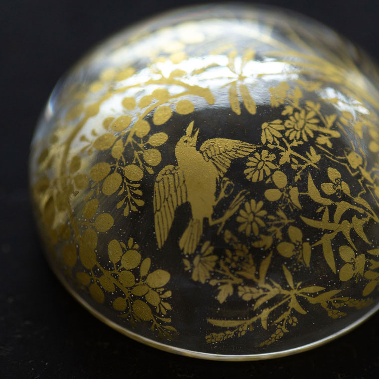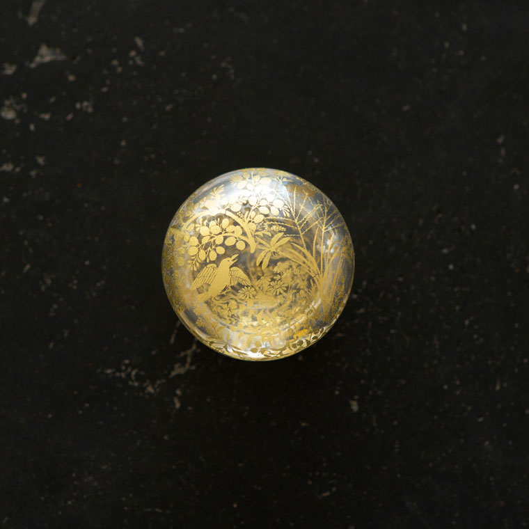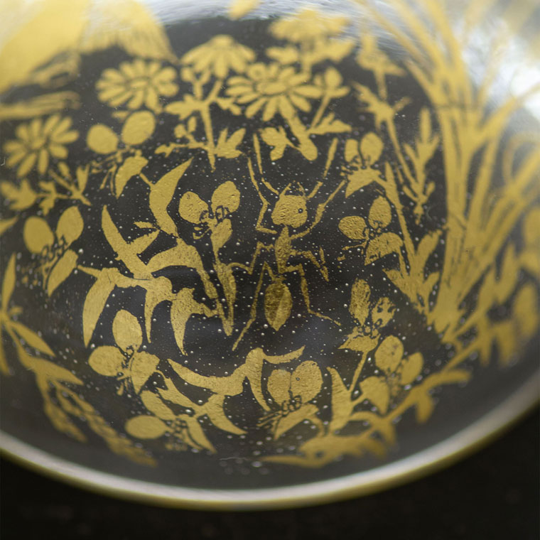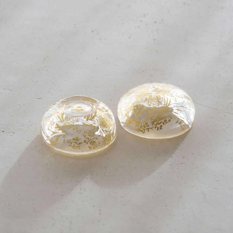 蓋物の用途は自由で「香合をはじめ、いつ見ても心引かれるもの、自分で発見した美しいと思ったもの、新しく出会ったものなどを入れていただけたら嬉しいです」。ガラスとガラスを擦り合わせ、ピッタリと合わさるように作っています。アクセサリーや揮発性のもの、薬品などもある程度の期間であれば状態を保ちやすいのもガラスの器の良いところだそうです。