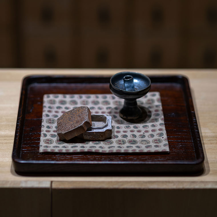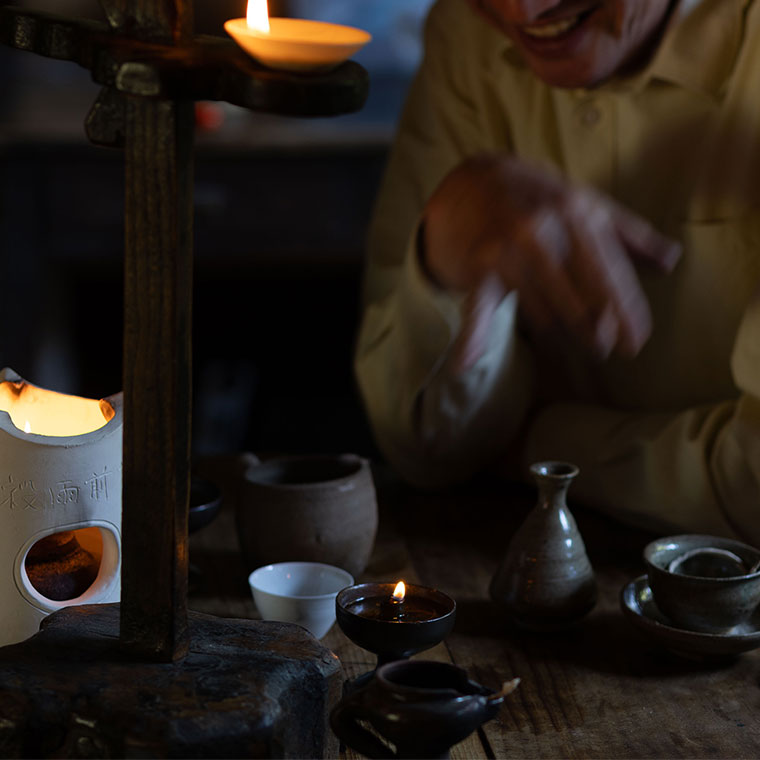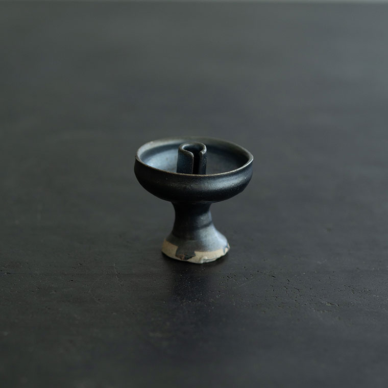 油を溜めたところに、こよりを灯芯として添え(油を吸い上げる)、こよりの先に火を灯して使う小さな灯火器です。