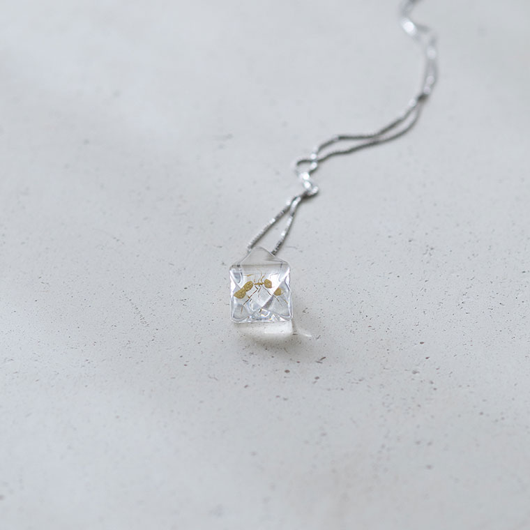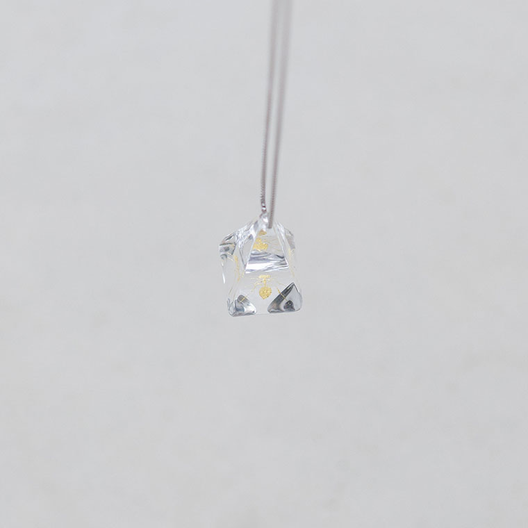 ガラスで金を挟むゴールドサンドイッチ技法をヒントに、由良さんが考案したオリジナル技法で制作。ガラスとガラスの間に金箔(金澄)を熱で圧着して、そこに細かな絵を彫り込んでいます。光の反射によって金の色味や図案がさまざまな表情になるよう、ガラスのカットやカーブを工夫しています。