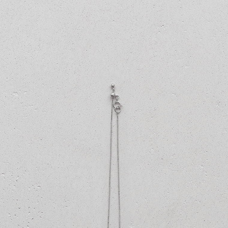 長さ約55センチのチェーンはシルバーで、硫化によって黒ずむのを防ぐため表面にロジウムめっき(ニッケルフリー)を施しています。(ロジウムは化学的に安定していて、金属の酸化や変色を防ぎ、とても硬いためメッキ剥がれも起こりにくいと言われています。ニッケルフリーのめっきで、金属アレルギーは出にくいと言われています)。