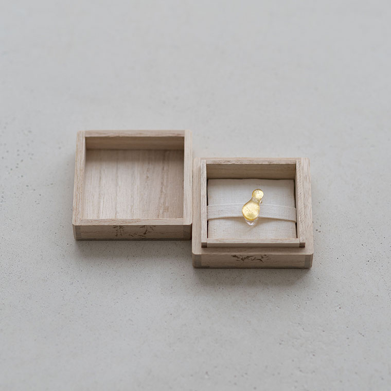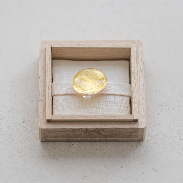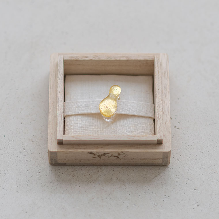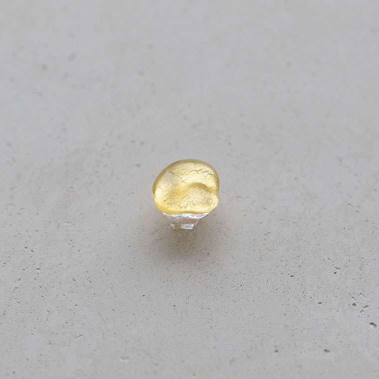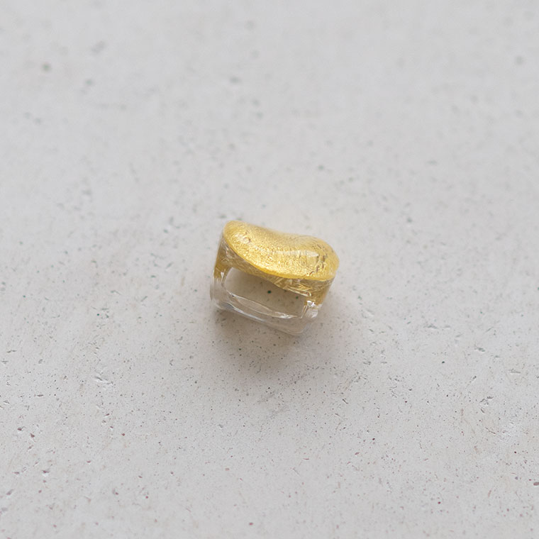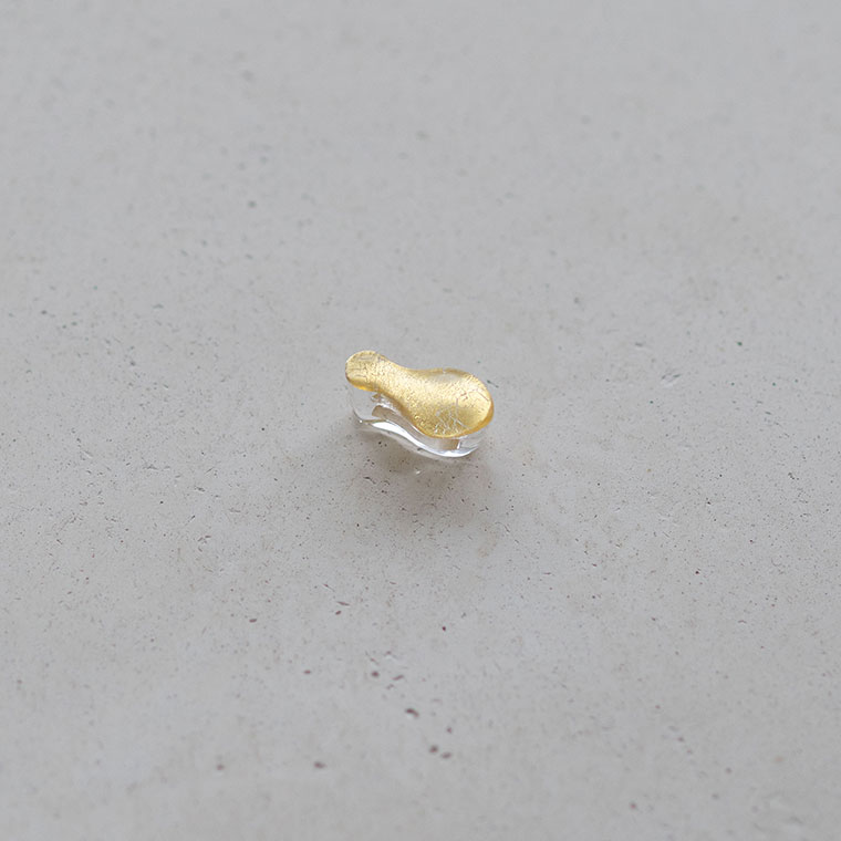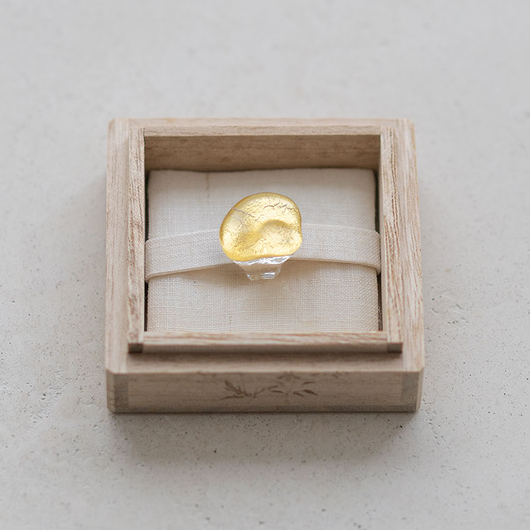ガラスで金を挟むゴールドサンドイッチ技法をヒントに、由良さんが考案したオリジナル技法で制作。ガラスとガラスの間に金箔(金澄)を熱で圧着していて、金箔の表情をそのまま愉しめます。反射がきれいに見えるようガラスの厚みやカーブを工夫しています。