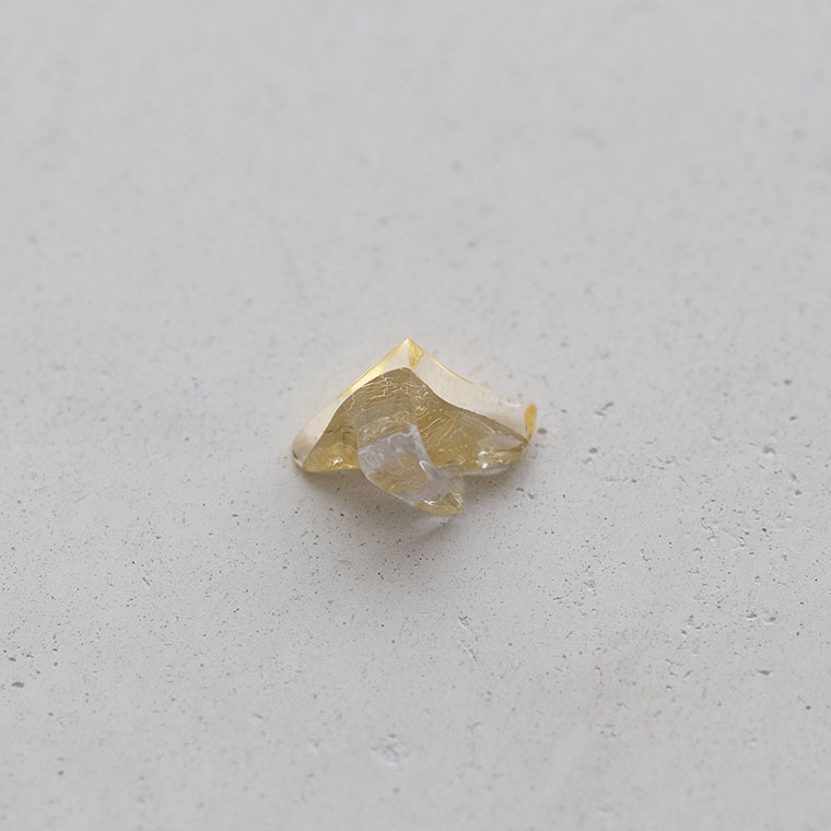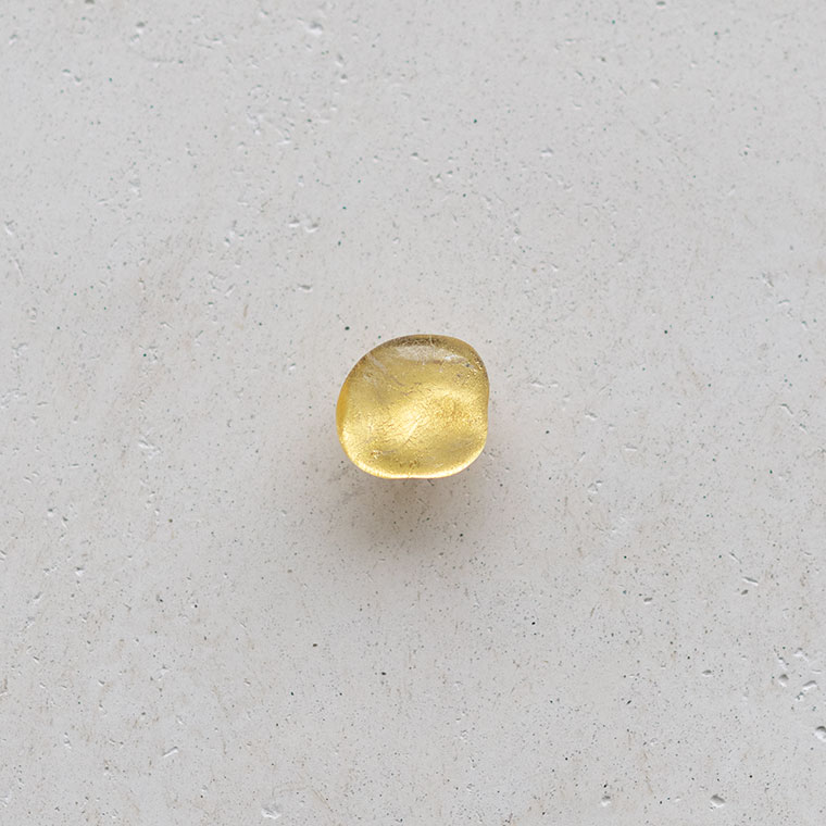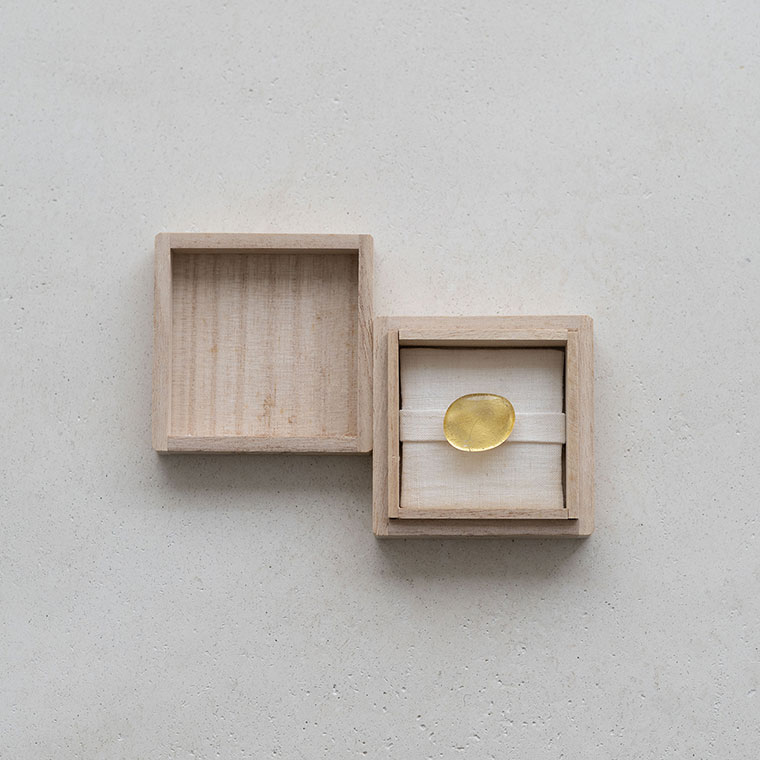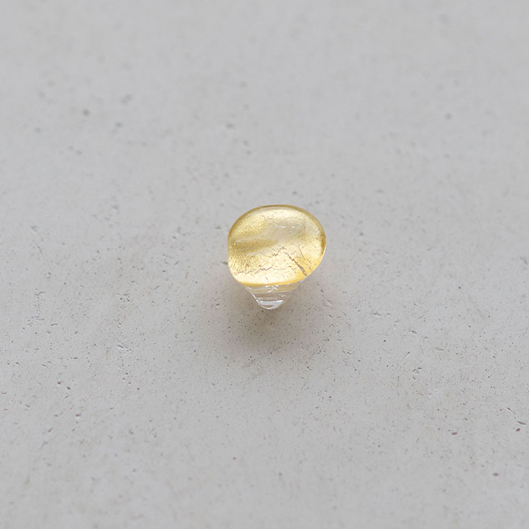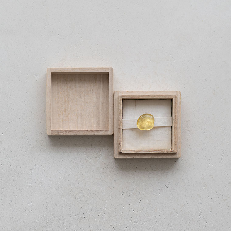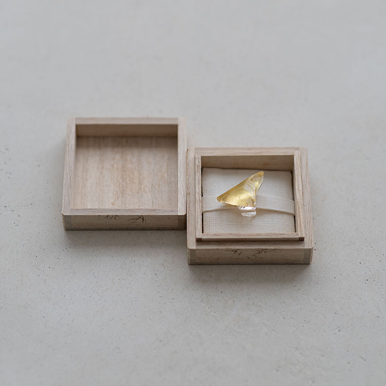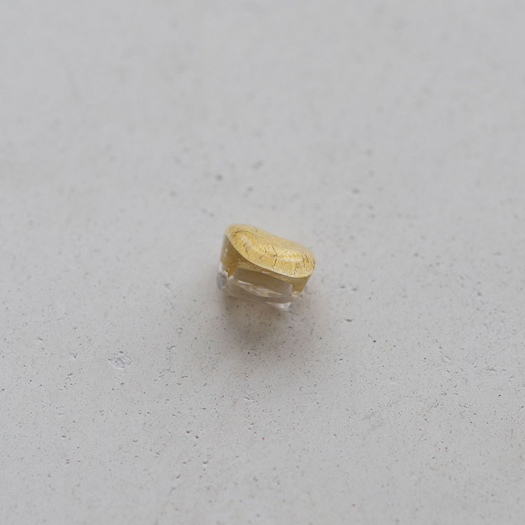ガラスで金を挟むゴールドサンドイッチ技法をヒントに、由良さんが考案したオリジナル技法で制作。ガラスとガラスの間に金箔(金澄)を熱で圧着していて、金箔の表情をそのまま愉しめます。反射がきれいに見えるようガラスの厚みやカーブを工夫しています。