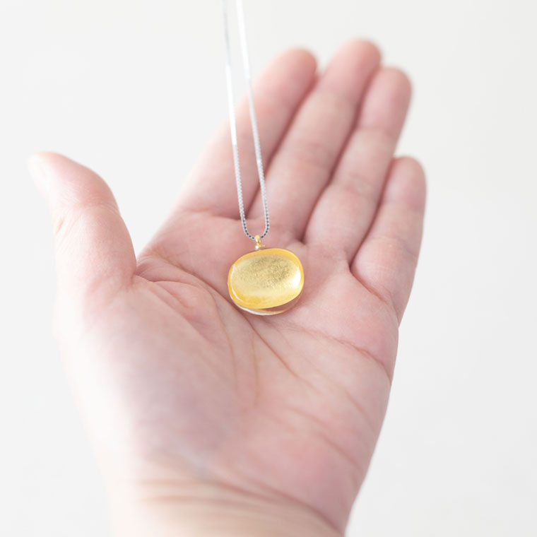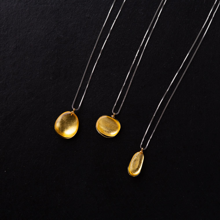 ガラスで金を挟むゴールドサンドイッチ技法をヒントに、由良さんが考案したオリジナル技法で制作。ガラスとガラスの間に金箔(金澄)を熱で圧着していて、金箔の表情をそのまま愉しめます。反射がきれいに見えるようガラスの厚みやカーブを工夫していて、表側のガラスは薄くて金箔との距離が短く、中央は少しえぐるようなカーブになっています。
