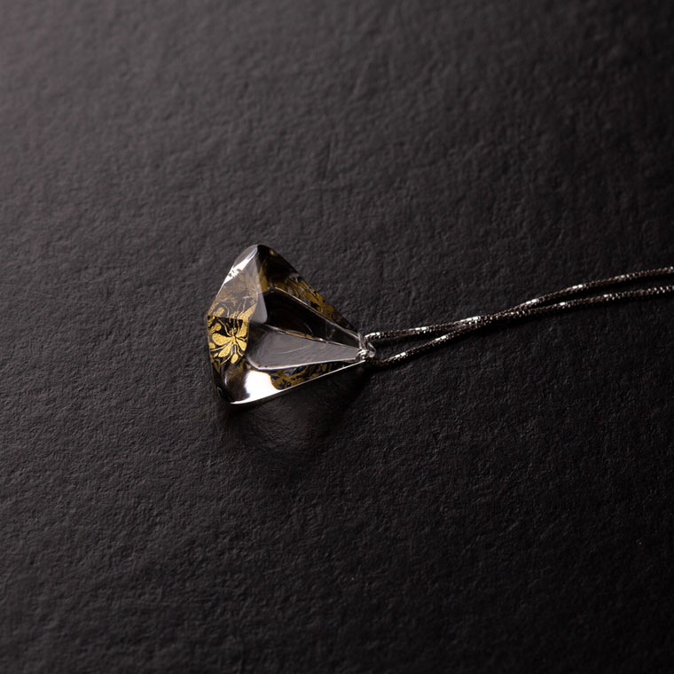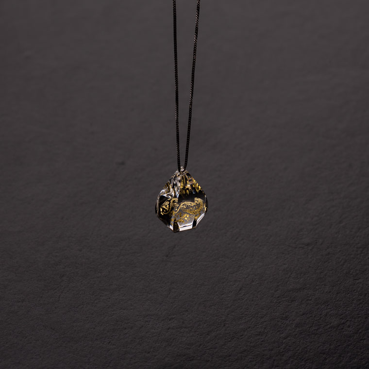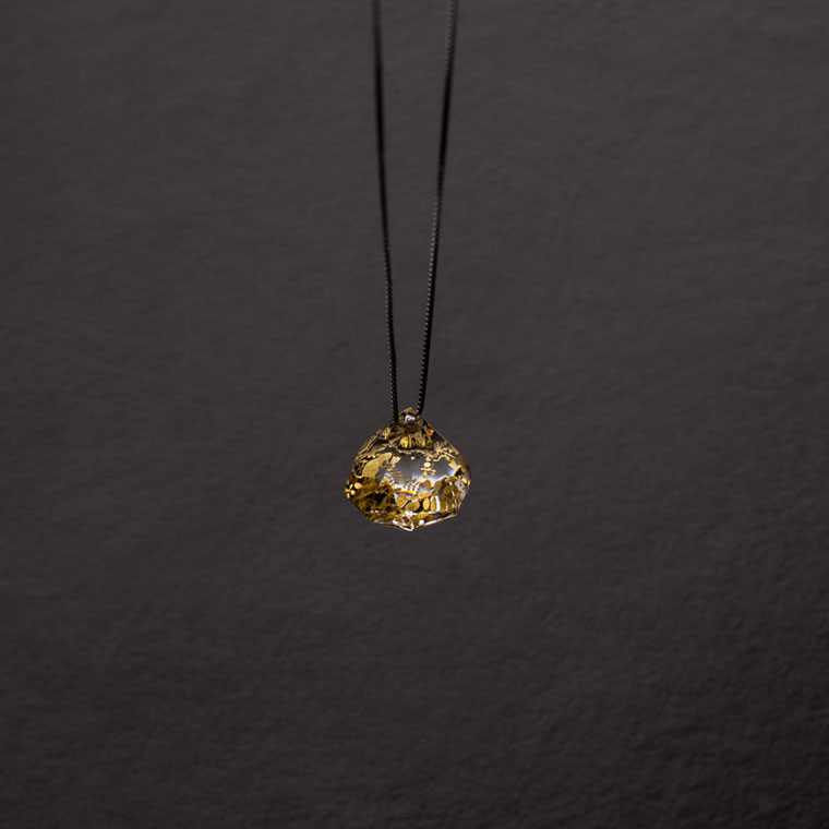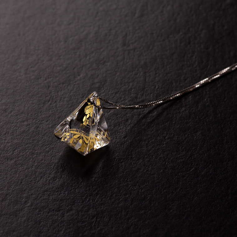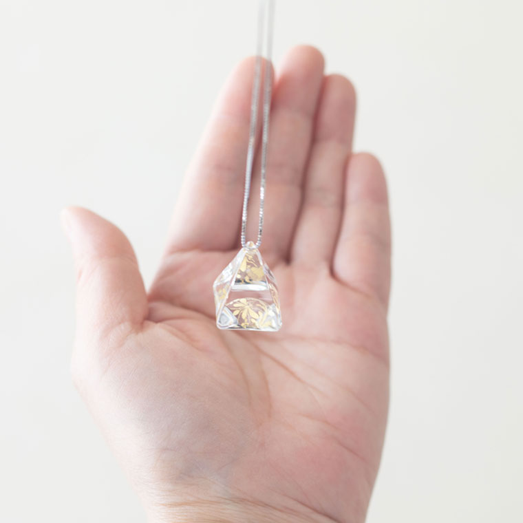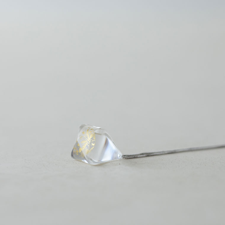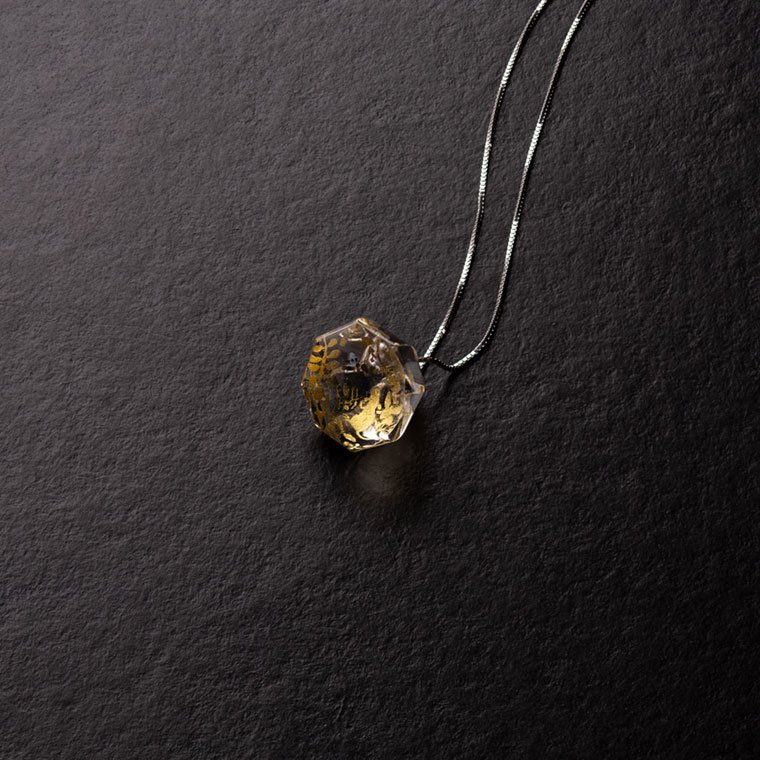 ガラスで金を挟むゴールドサンドイッチ技法をヒントに、由良さんが考案したオリジナル技法で制作。ガラスとガラスの間に金箔(金澄)を熱で圧着して、そこに細かな絵を彫り込んでいます。光の反射によって金の色味や図案がさまざまな表情になるよう、ガラスのカットやカーブを工夫しています。
