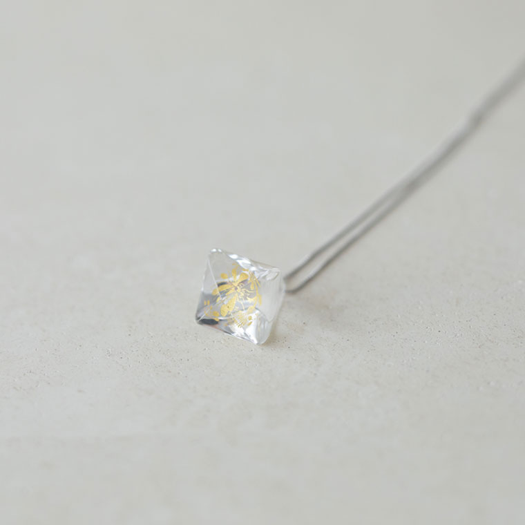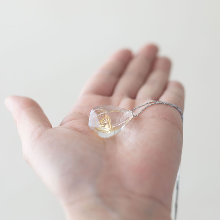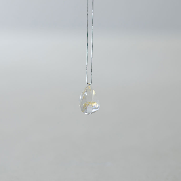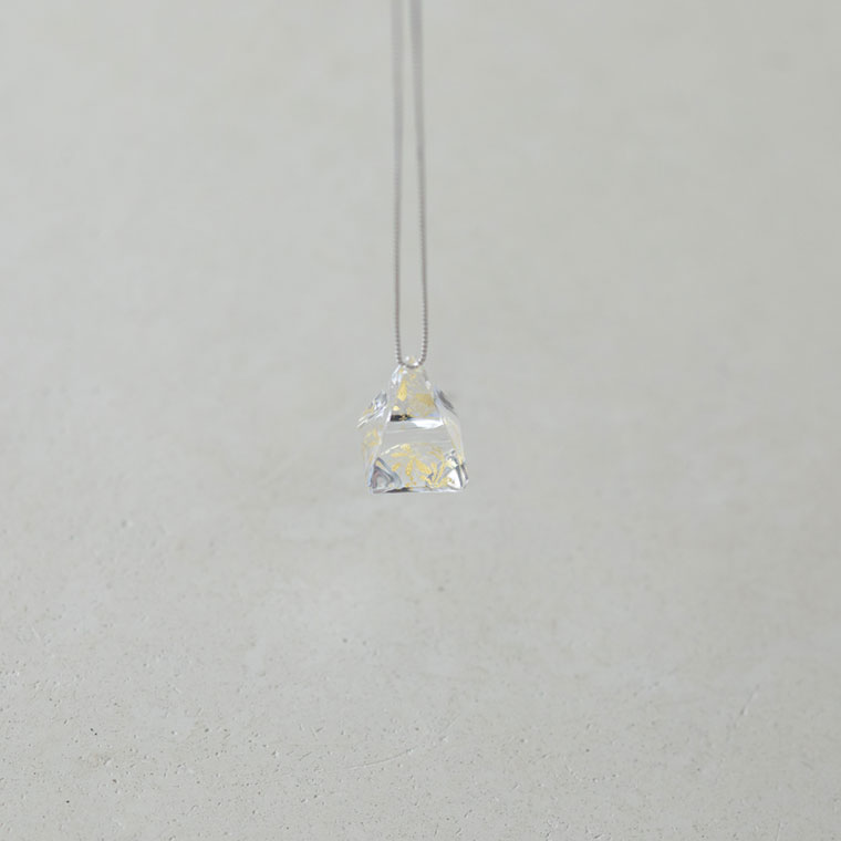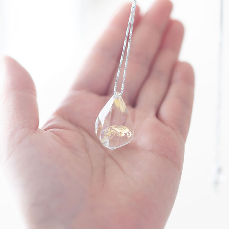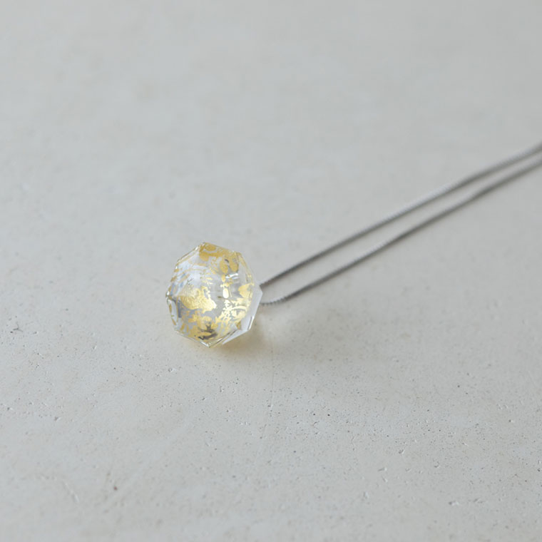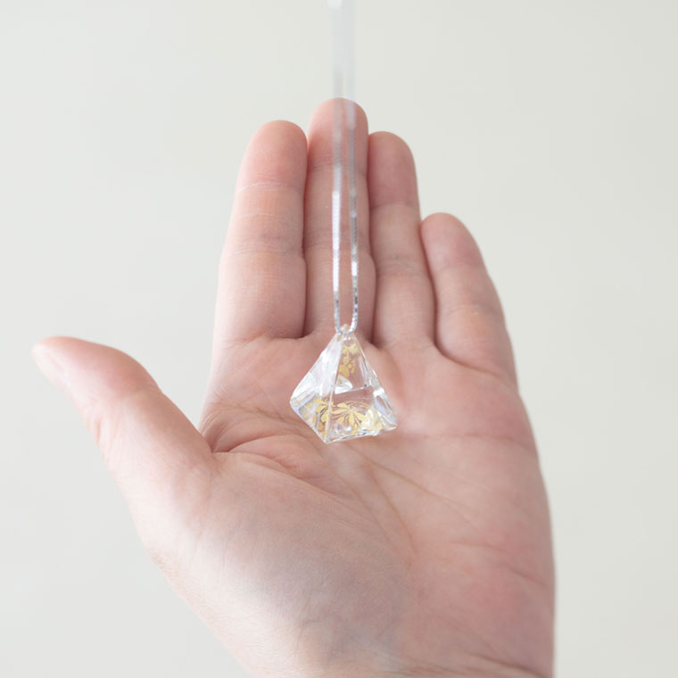 ガラスで金を挟むゴールドサンドイッチ技法をヒントに、由良さんが考案したオリジナル技法で制作。ガラスとガラスの間に金箔(金澄)を熱で圧着して、そこに細かな絵を彫り込んでいます。光の反射によって金の色味や図案がさまざまな表情になるよう、ガラスのカットやカーブを工夫しています。