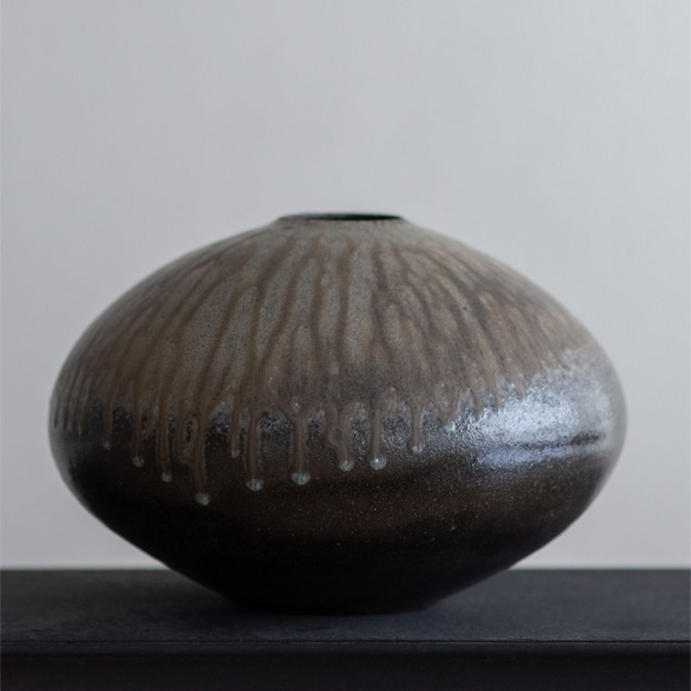 高さ約20cm、胴径約30cm、低重心の花器で自然釉の表情がはっきりと出ています。