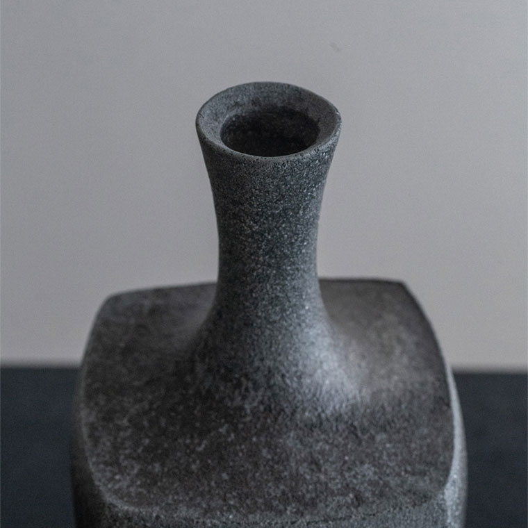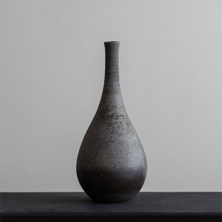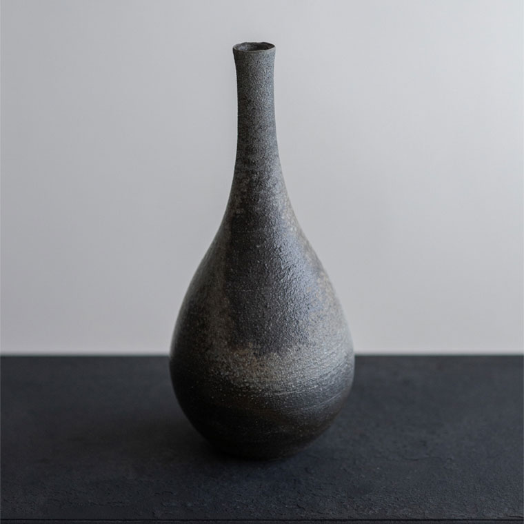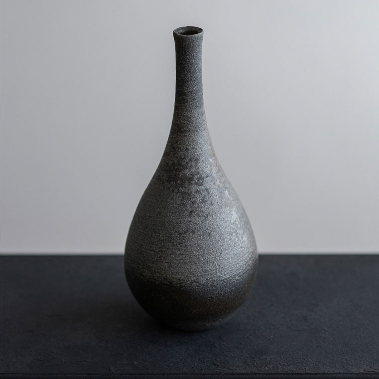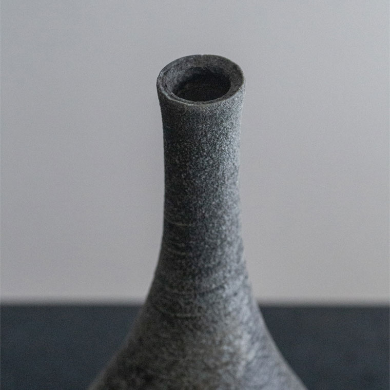 高さ約30cm、安定感のある底部にのびやかな鶴首。灰被りの落ち着いた佇まいです。